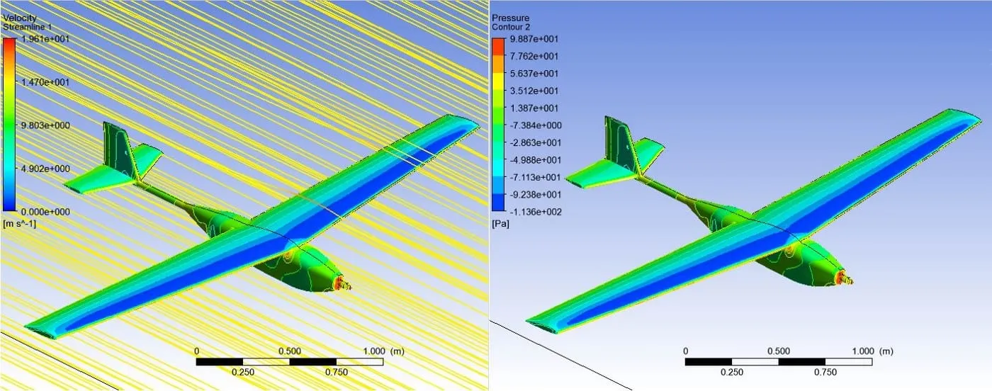 Last year our team manufactured the above plane using the design and tooling created the year before. We used ANSYS Fluent analysis to verify hand calculations on the aerodynamics for the new plane. The simple 2D lift and drag hand calculations matched up surprisingly closely to the more complex model of the plane in ANSYS.